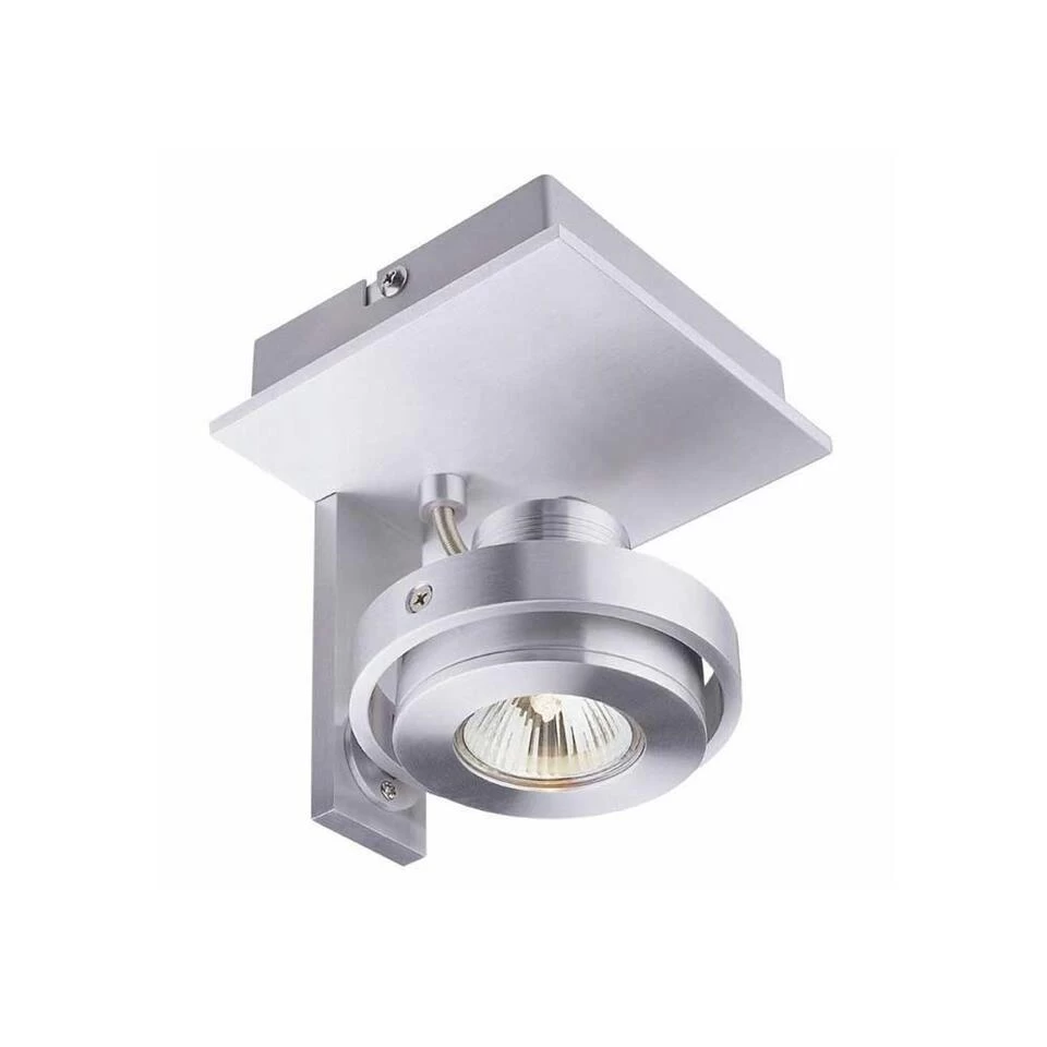 Deze 1 lichts spot is eventueel ook geschikt om aan de wand te monteren. De breedte is 11,5 cm en de totale hoogte is 15 cm. Kleur: Aluminium.