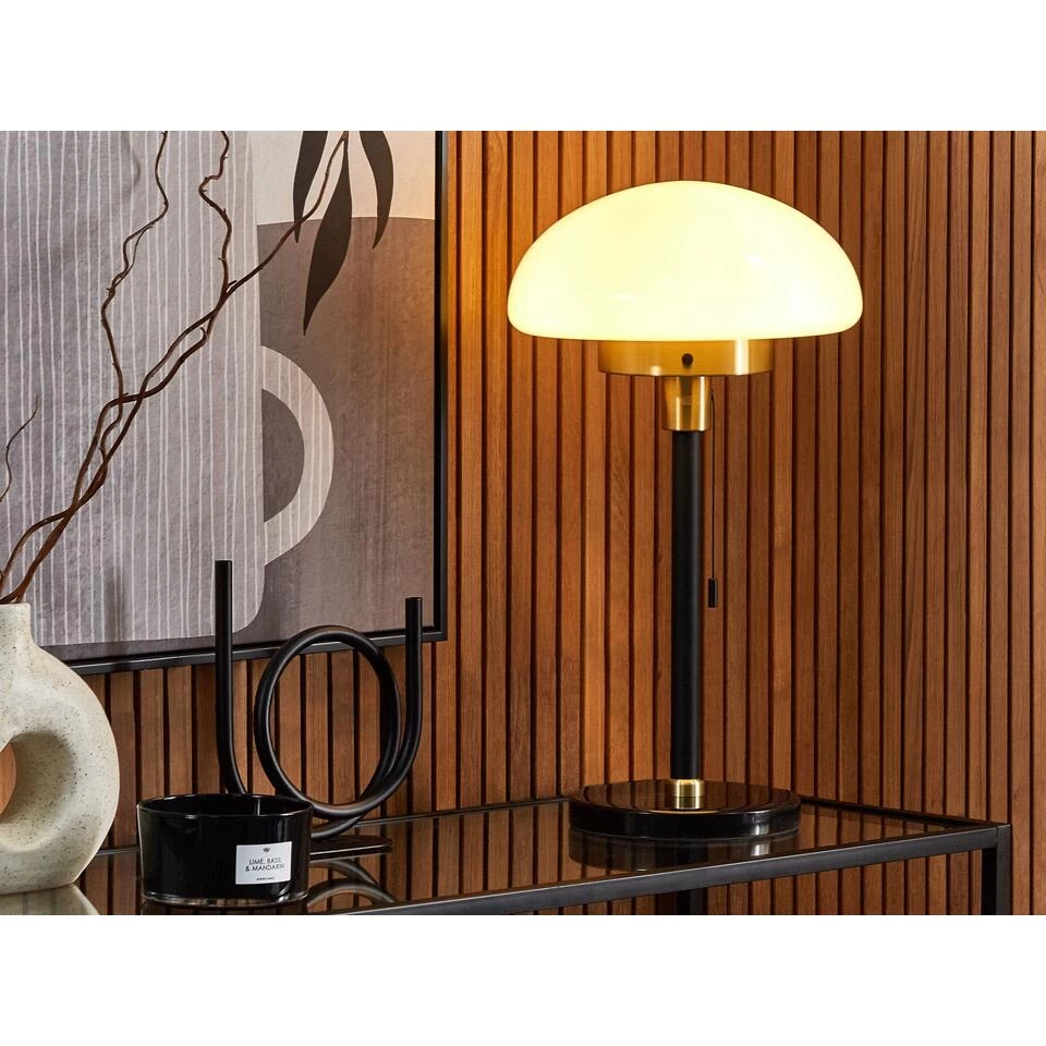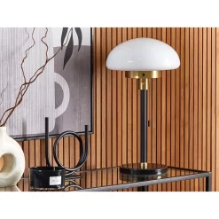 Klassieke Tafellamp Woonkamer. Verfaai je interieur met een decoratieve tafellamp die dankzij het klassieke, retro-geïnspireerde ontwerp een mooie aanvulling is op ruimtes met verschillende stijlen. Goudkleurige elementen en een schakelaar zorgen voor een geraffineerde touch, die in combinatie met de glazen kap met halve bol een vintage uitstraling creëert. Plaats deze lamp op een bijzettafel of naast je bed en geniet van het mooie, sfeervolle licht wanneer het buiten donker wordt.
