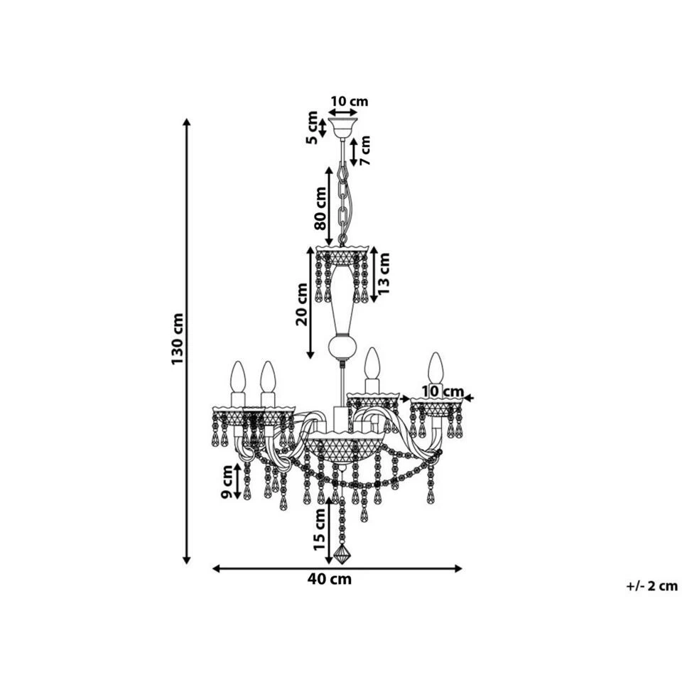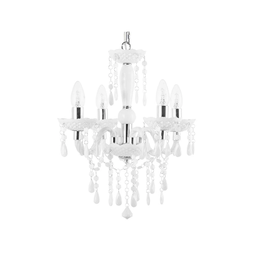 Kroonluchter met sprankelende kristallen elementen. Qua sierlijkheid is deze betoverende kroonluchter moeilijk te verslaan. De vier gebogen lichtarmen van wit plastic zijn uitgerust met sprankelende kristallen elementen, die mooie lichteffecten bieden. Zonnestralen en kaarslicht worden weerspiegeld in de decoratieve elementen en omhullen de kamer in warm licht. Een hoogtepunt voor alle klassieke en elegante interieurs. De lamp is voorzien van een transparante kabel en robuuste kettingophanging.