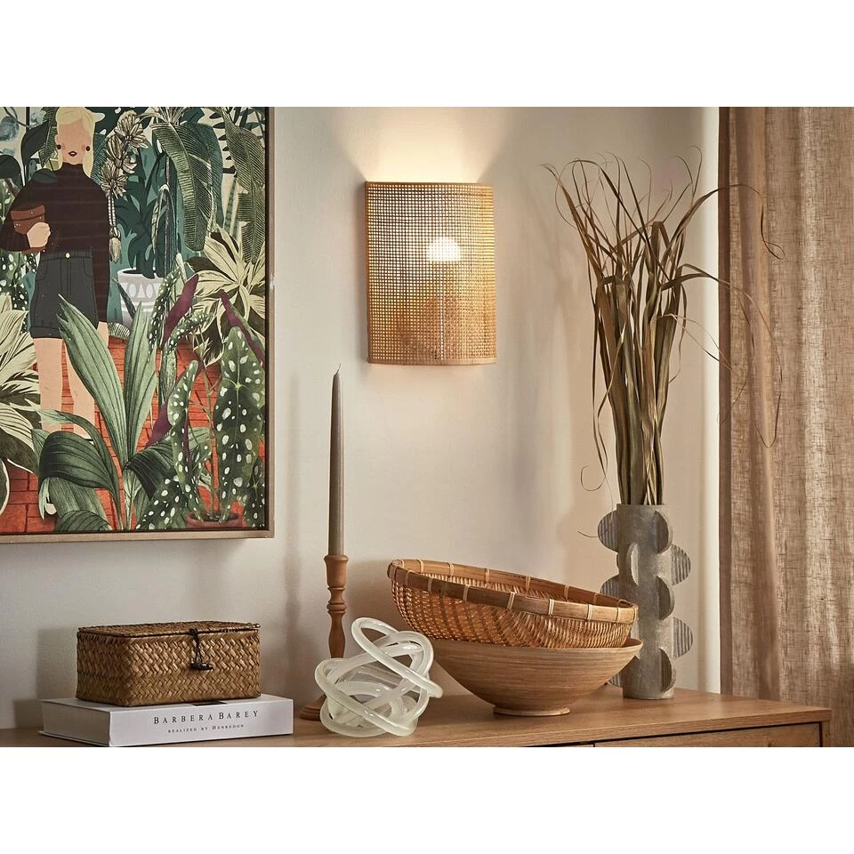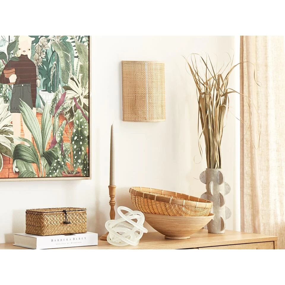 Boho woonkamer muurlamp. Deze wandlamp is de perfecte keuze voor elke liefhebber van boho-stijl. De lampenkap van rotan zorgt voor mooie, sfeervolle verlichting in elke ruimte, van woonkamer tot keuken. Dankzij het minimalistische design past de lamp gemakkelijk in veel verschillende interieurs. Hang de lamp in de woon- of slaapkamer samen met andere natuurlijke decoraties of meubels om een authentieke rustieke en boho look te creëren.