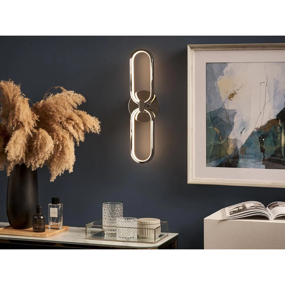 Accent Muur Scone. Wandlamp in de kenmerkende vorm van twee met elkaar verbonden schakels. Het product is gemaakt van metaal met een zilveren afwerking en voorzien van energiebesparende LED-diodes. De lamp zal het decor van elk interieur verrijken, van een elegant kantoor tot een moderne slaapkamer. Subtiel wit licht zal schilderijen of decoraties die aan de muur hangen prachtig benadrukken.
