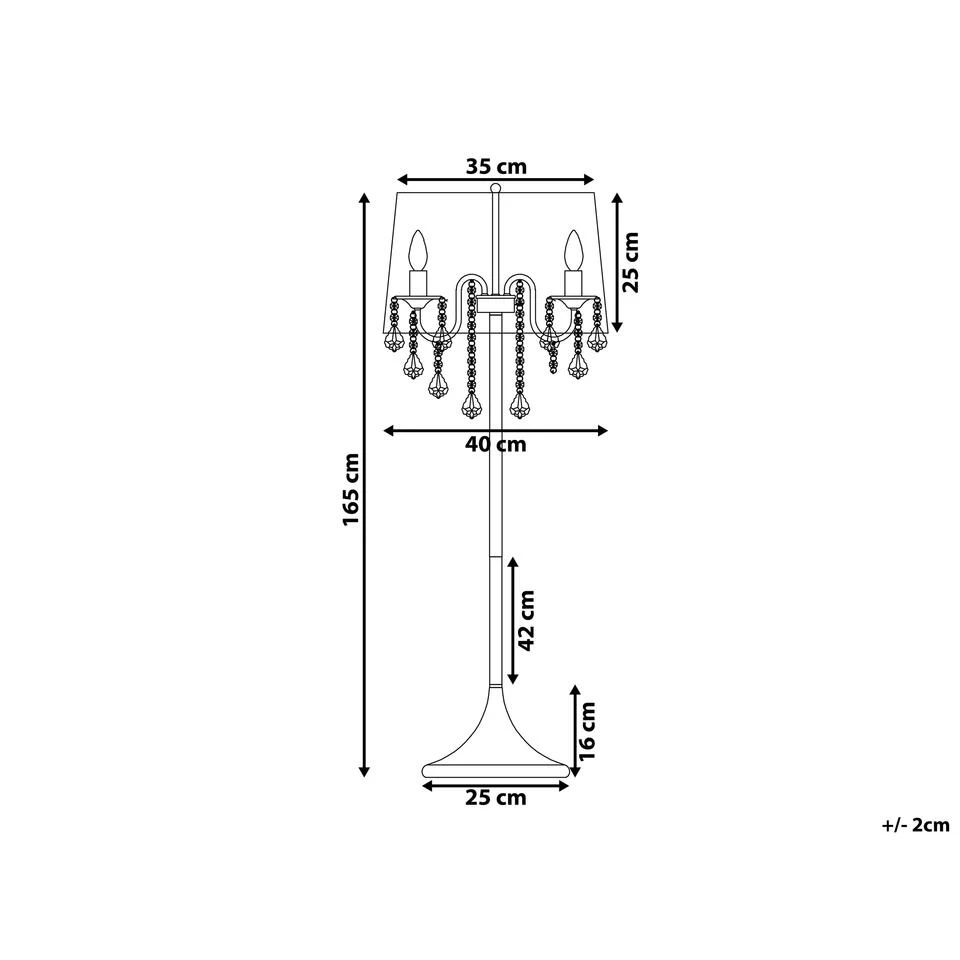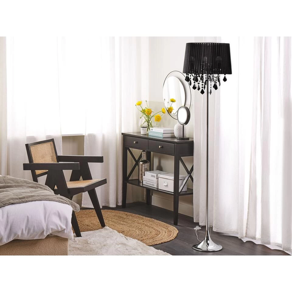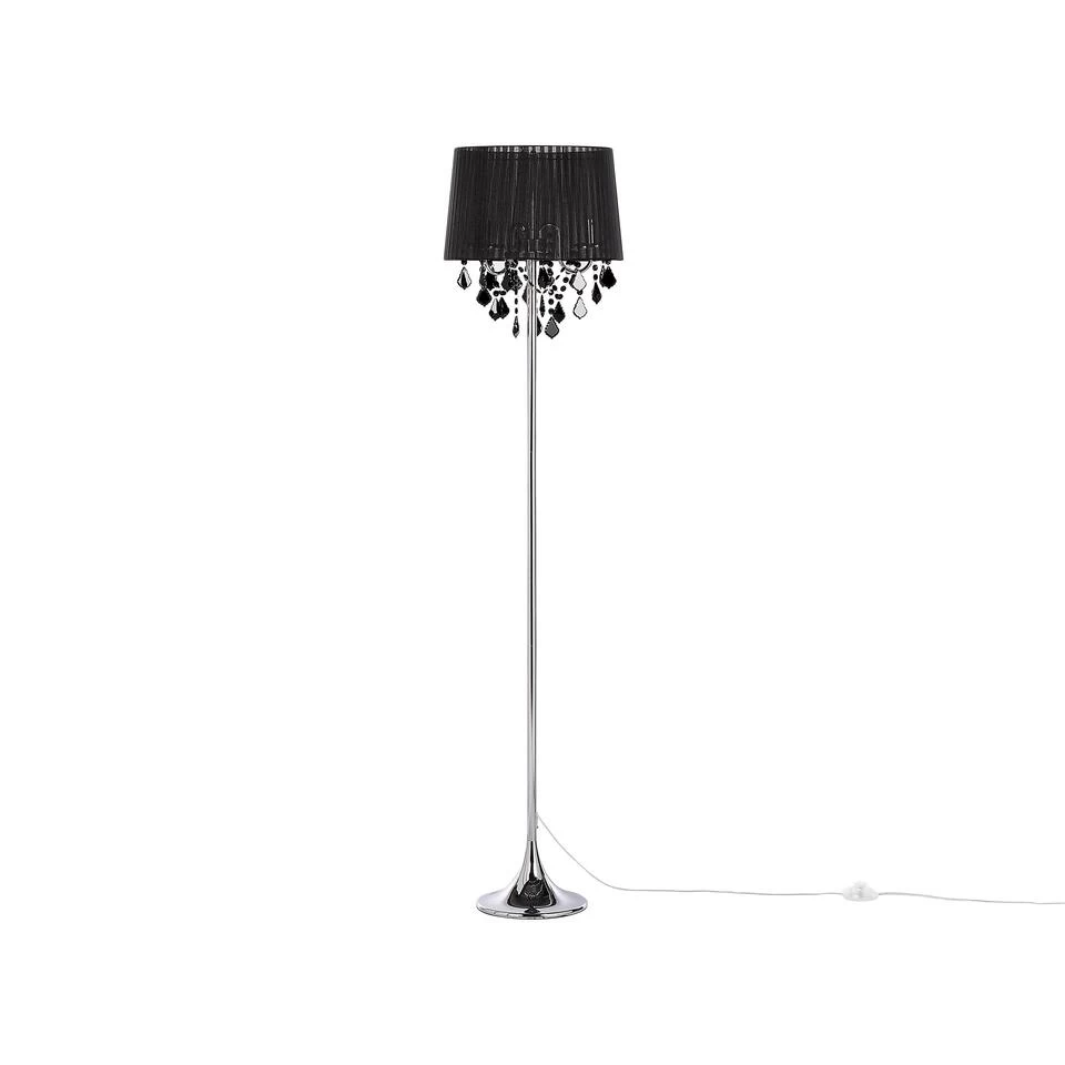 Moderne vloerlamp met doorschijnende lampenkap. Deze charmante vloerlamp is een geslaagde combinatie van een decoratief element en een trendy lamp. De kroonluchter met drie lampen en een ronde lampenkap van doorschijnende, zwarte stof verspreidt een aangenaam, helder licht en de kristallen elementen zorgen voor mooie lichteffecten. De lamp heeft een aan/uit-schakelaar en is geschikt voor lampen met de E14-fitting met een maximum van 40W.