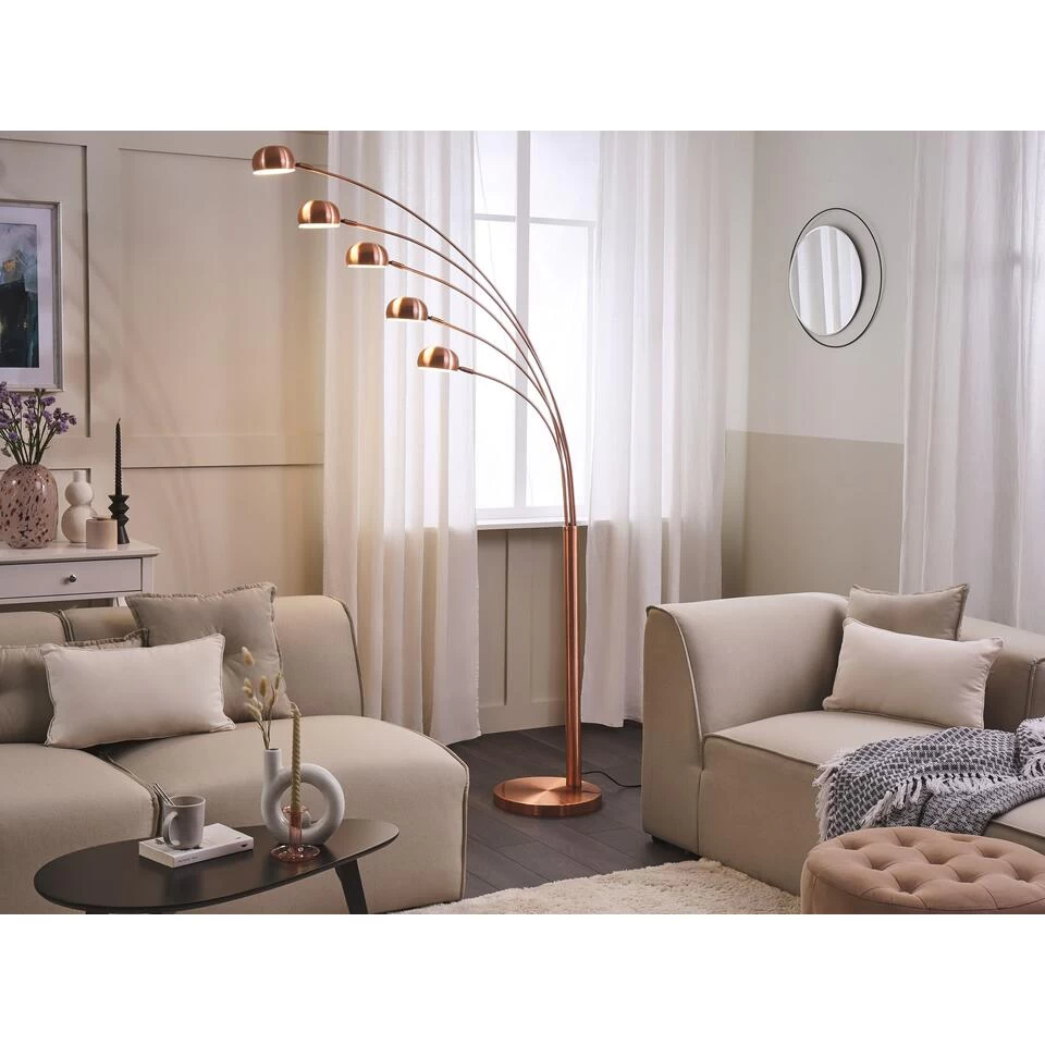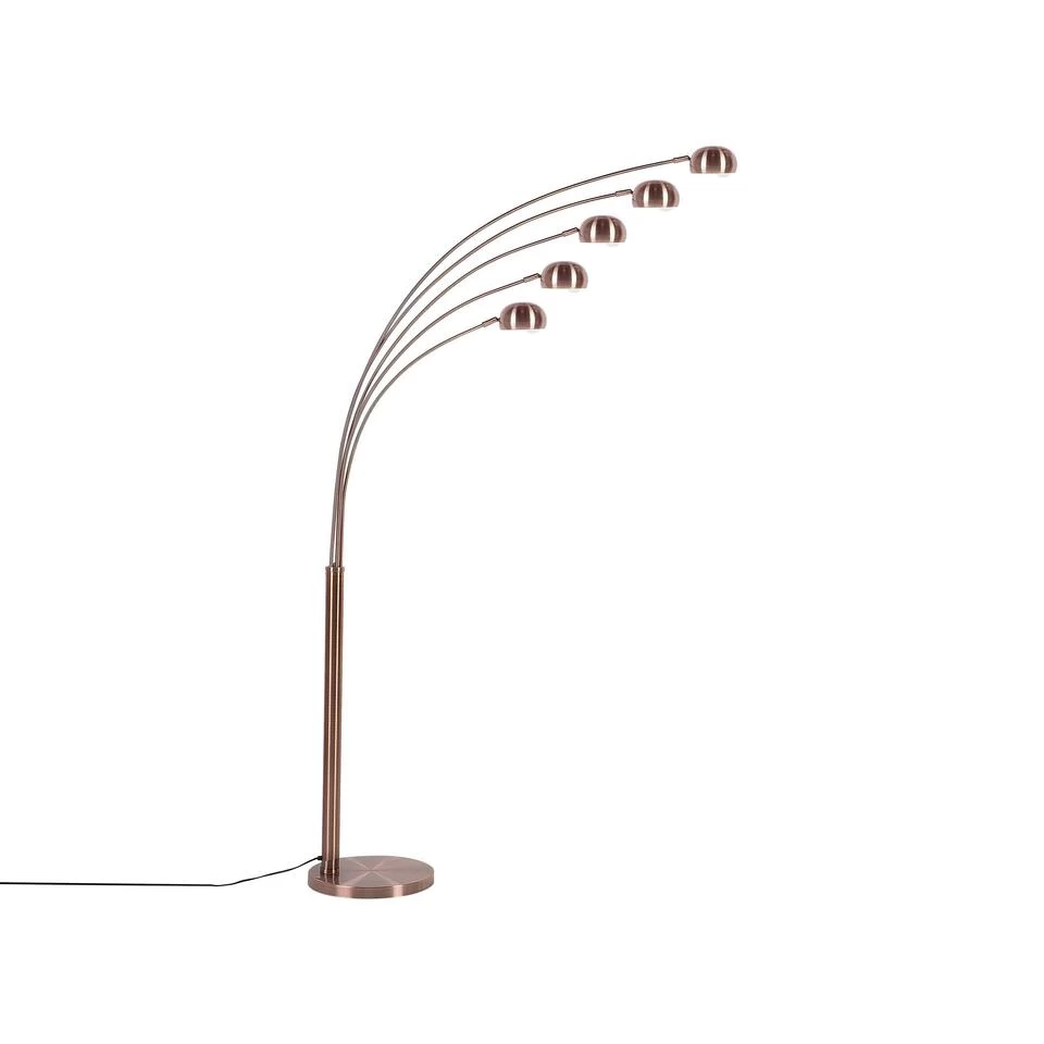 Vloerlamp van koperkleurig metaal. De stijlvolle lamp gemaakt van glanzend, koper metaal in het populaire retro-ontwerp verheugt zich met zijn slanke, sierlijk gebogen vorm. De vijf verstelbare, ronde lampenkappen zorgen voor een optimale verlichting van je leeshoek en de robuuste lampvoet van marmer garandeert stabiliteit. De lamp is uitgerust met een zwarte PVC-kabel.