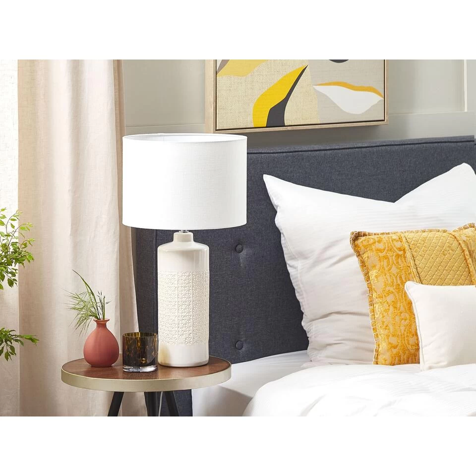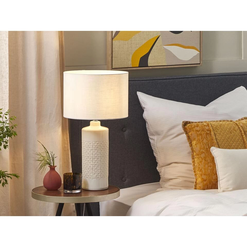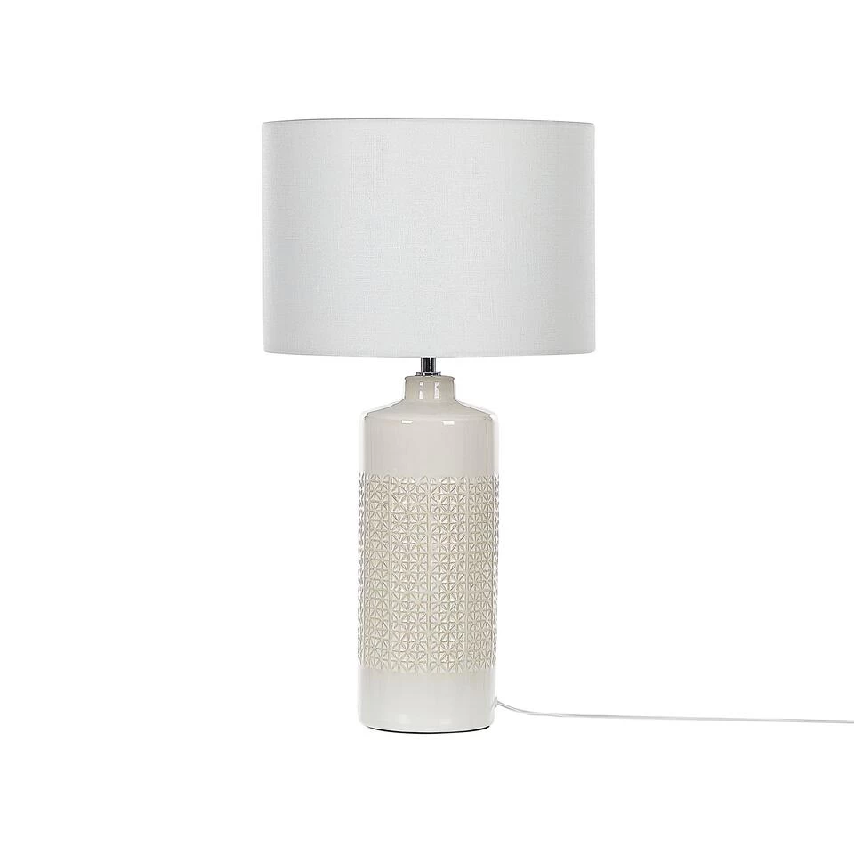 Glanzende keramische bedlamp. Deze Scandinavische tafellamp met accent is perfect voor styling in woonkamers of gangen. De hoge keramische basis is glanzend en heeft een reliëfpatroon dat lijkt op kleine sterren. Uitgerust met een kap, geeft het een zacht, diffuus licht, wat een humeurige sfeer creëert. Gebruik hem als sfeerverlichting naast je bank, of als leeshulp aan het bed.