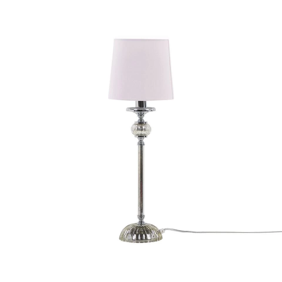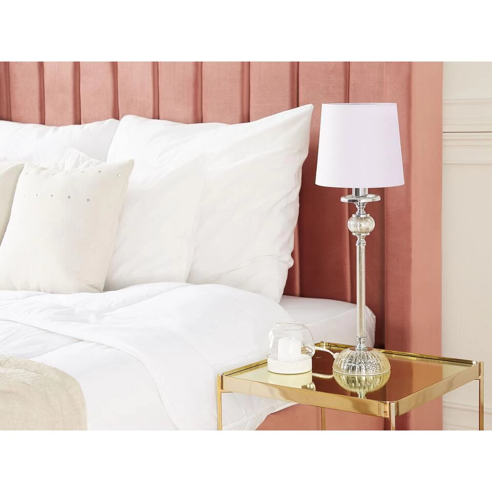Tafellamp met roze lampenkap. De lange, slanke hals en de halfronde poot van zilverglazen geven deze tafellamp veel charme. Bovendien onderstreept het contrast tussen de glanzende elementen en de matte, roze stof van de kap het uiterlijk van de lamp – een tijdloos accessoire voor jouw woon- en werkgebied.