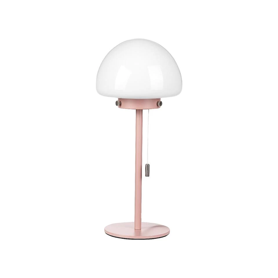 Minimalistische bureaulamp met trekkoord. Geef je interieur een upgrade met deze opvallende tafellamp. Het stuk heeft een halfronde glazen lampenkap in wit en heeft een roze basis die zeker zal opvallen en past in veel verschillende slaapkamers, woonkamers en werkkamers in retro, hedendaagse en moderne stijl. De lamp is gemakkelijk aan en uit te zetten dankzij het trekkoord.