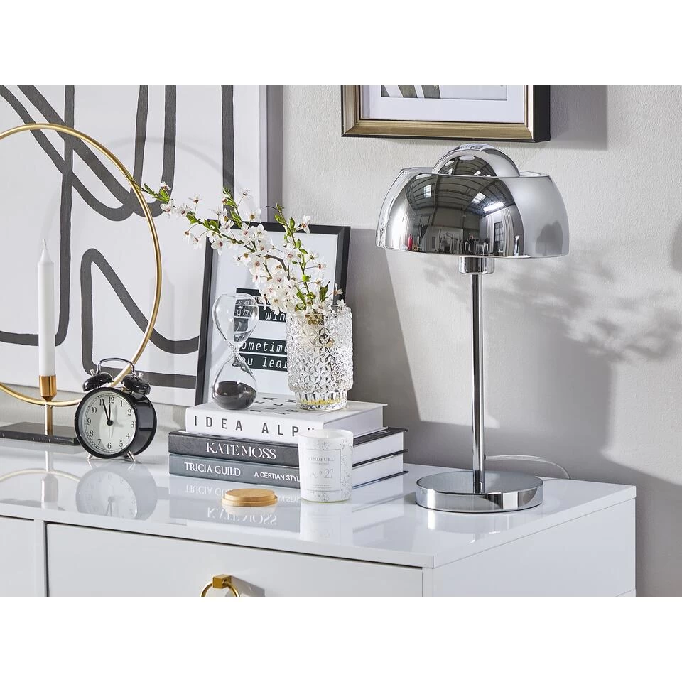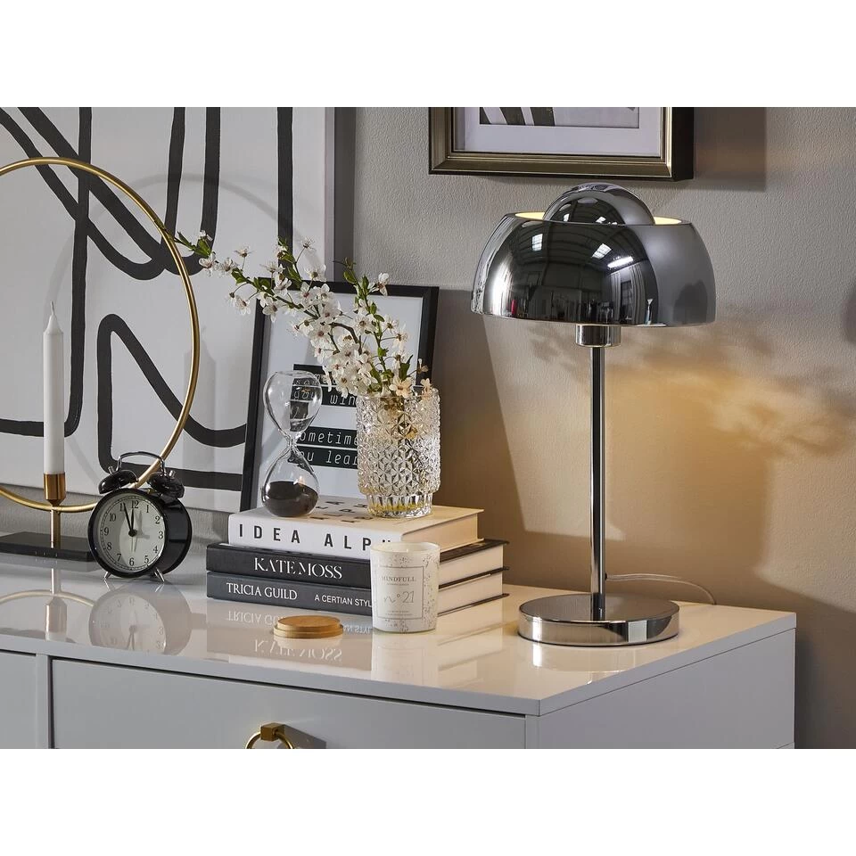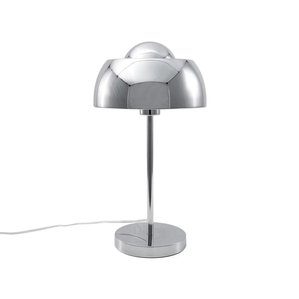 Verchroomde tafellamp. Een tafellamp hoeft niet alleen praktisch en functioneel te zijn, hij kan daarnaast ook jouw inrichting compleet maken met zijn design. De slim gebogen lampenkap van deze lamp is voorzien van een kleine koepel en rust op een filigraanarm en een ronde, stabiele lampvoet. Het verchroomde materiaal onderstreept het moderne design met een mooie glans.