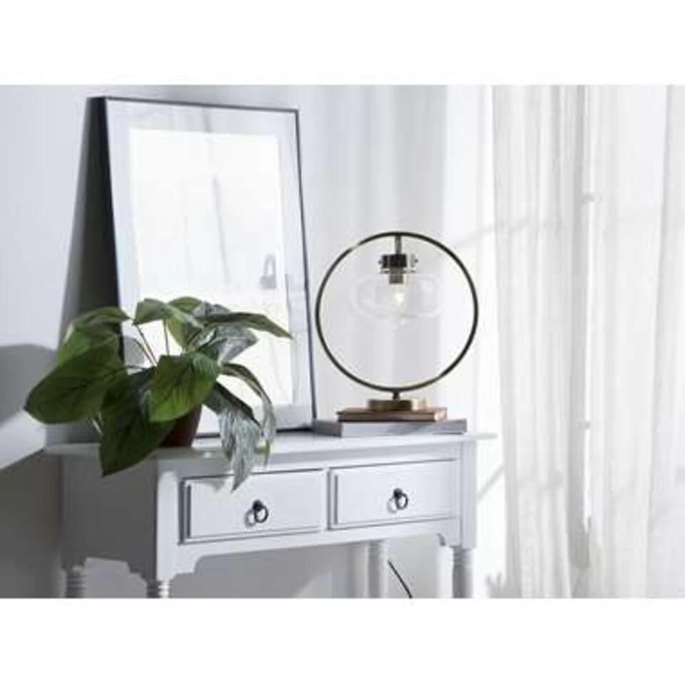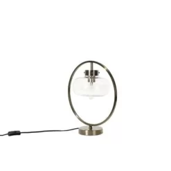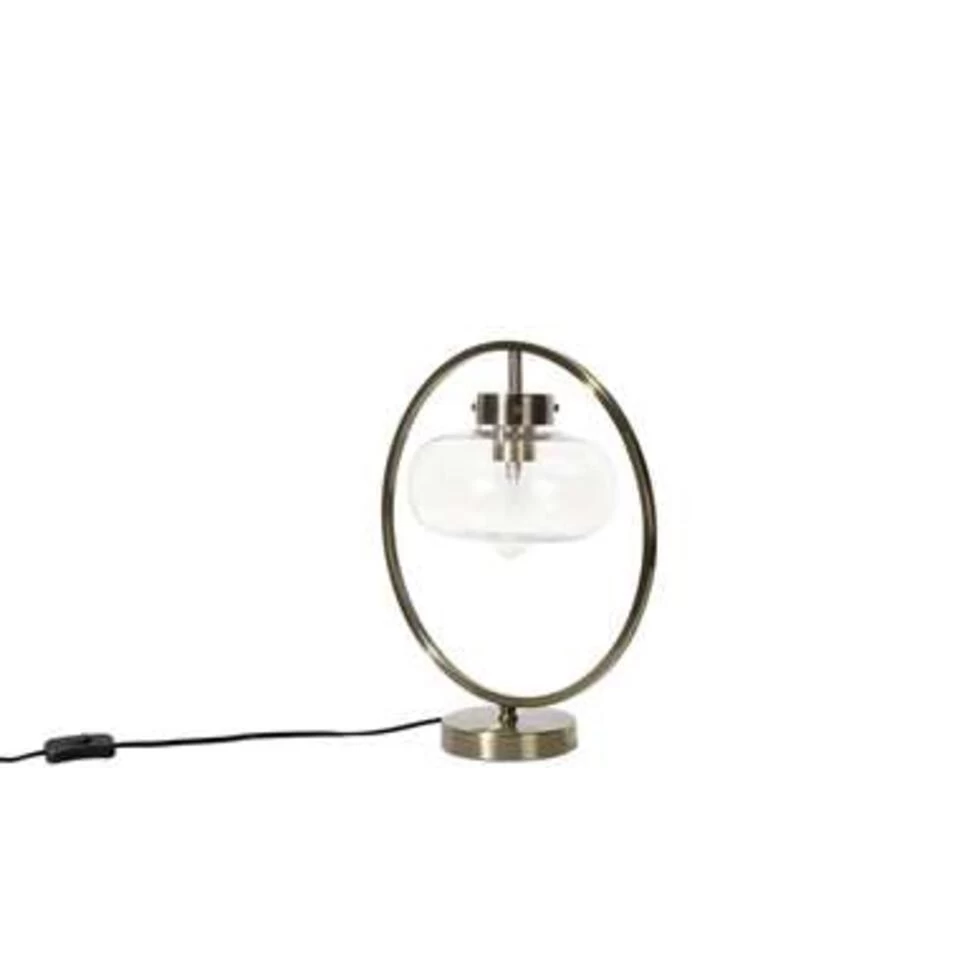 Industriele tafellamp met uniek rond frame. Het tijdloze en exclusieve design van de stijlvolle tafellamp onderstreept zijn elegante uitstraling. De gebogen lampenkap van helder glas hangt in een gebogen, filigraan frame van metaal met een gouden look. Let bij het kiezen van een geschikte lichtbron op de afmetingen van de lampenkap. Dankzij de lange zwarte kabel kan de lamp ook op hoge meubels worden geplaatst.