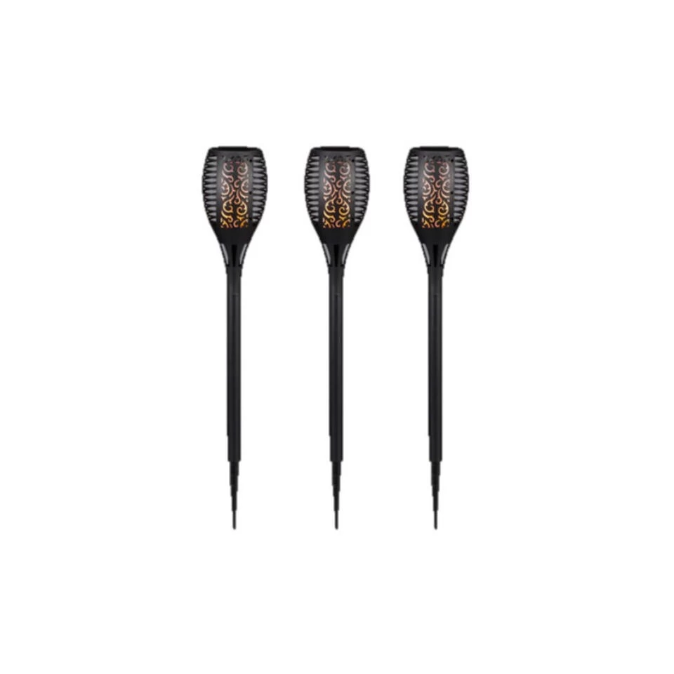 Solar tuinlamp/tuinfakkel met vlameffect Led verlichting voor de tuin. De lamp werkt op zonne-energie waardoor het zichzelf oplaadt gedurende de dag. Inclusief voet met twee standen, muurbevestiging en grondpin, zodat u ze bijvoorbeeld langs een looppad kunt zetten. Schakelaar: ja. Kleur licht: warm wit, vuureffect. Kleur lamp: zwart. Afmeting: 58 x 10 x 10 cm. Materiaal: kunststof. Inclusief batterijen. Tuinlampen/tuinverlichting/prikspots op zonne-energie.