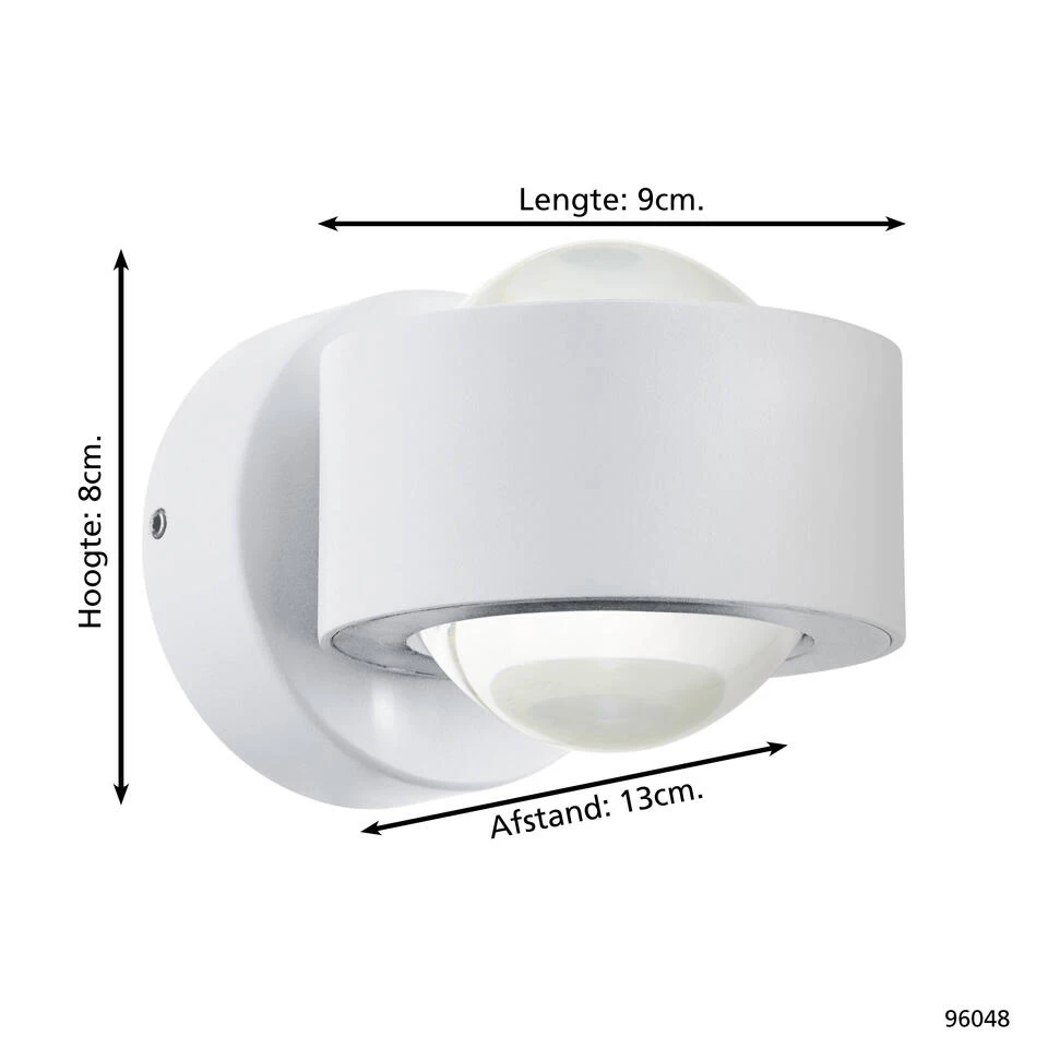 De EGLO Ono 2 is een wandlamp gemaakt van aluminium en helder glas. De lamp heeft een wit zijdeglans afwerking. Deze lamp heeft twee geïntegreerde LED modules met een wattage van 2,5W. Het licht van de lamp schijnt aan de boven- en onderzijde. De lamp geeft warm wit licht (3000K) en is niet dimbaar. De wandlamp Ono 2 is toepasbaar in diverse woon- en/of werkruimten.