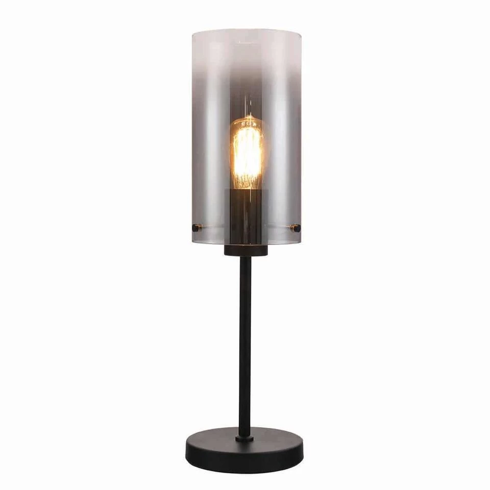 De hoogte van deze tafellamp is 58 cm en de voet heeft een doorsnede van 16 cm. Het glas zelf heeft een hoogte van 28 cm en de breedte is 15 cm. Dit armatuur is geschikt voor een lichtbron van maximaal 40 Watt E27 (excl.). Kleur: mat-zwart metaal met zwart snoer (incl snoerschakelaar) en voorzien van rook kleurig glas.