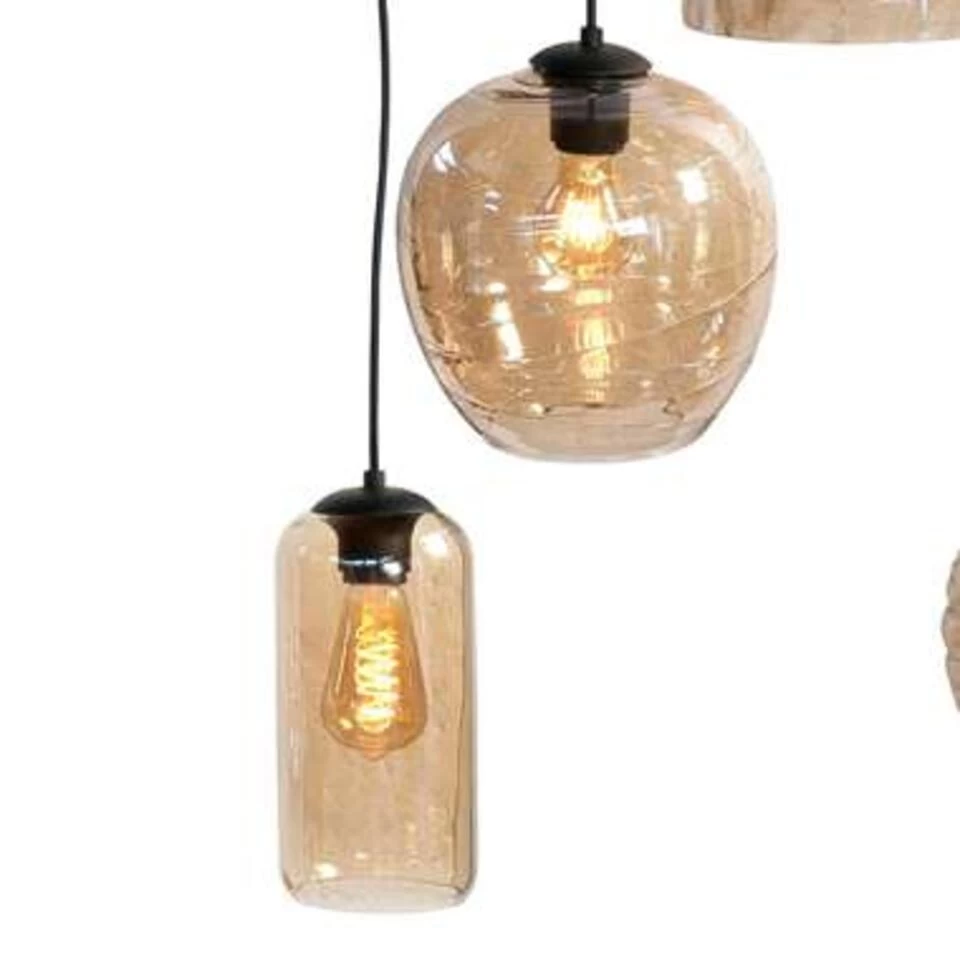 Deze grote Fantasy hanglamp van leverancier Highlight is voorzien van 6 glazen die een amber kleurige coating hebben. Deze lamp heeft 5 verschillende soorten kelken met een diameter van 12-20 cm en een hoogte van 18-25 cm. De totale hoogte van dit armatuur is instelbaar maar maximaal 130 cm, de plafondplaat heeft een lengte van 130 cm en een breedte van 35 cm.
