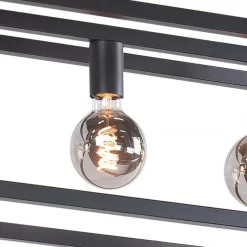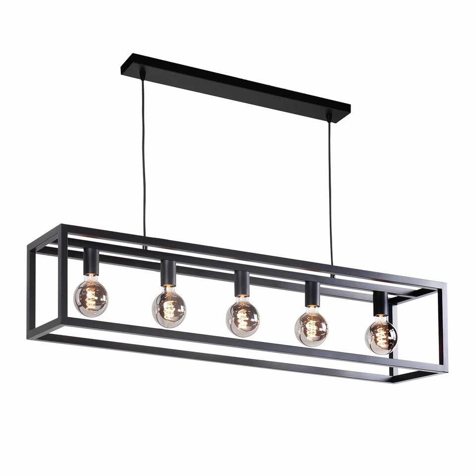 Leuke opengewerkte minimalistische hanglamp die geschikt is voor boven een langwerpige tafel van ongeveer 175 – 200 cm. De lengte van deze Fragola hanglamp is 120 cm en het metalen frame heeft een hoogte en breedte van 25 cm. Door de lengte van deze lamp en de afstand tussen de 5 fittingen ontstaat er een goede lichtspreiding boven de tafel. Zeer geschikt voor mooie Filament lichtbronnen met een E27 fitting (excl.).