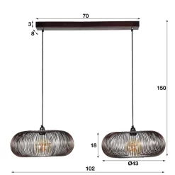 De industriële hanglamp Jill is gemaakt van koperkleurig metaal en bevat gouden soldeerplekken. Deze zijn op verschillende plekken te bewonderen en deze gouden details geven de lamp een heel uniek uiterlijk! De lampenkappen hangen aan een zwarte kabel en zijn bevestigd aan een plafondbevestiging. Alle lampenkappen hebben een diameter van 43 cm.Â