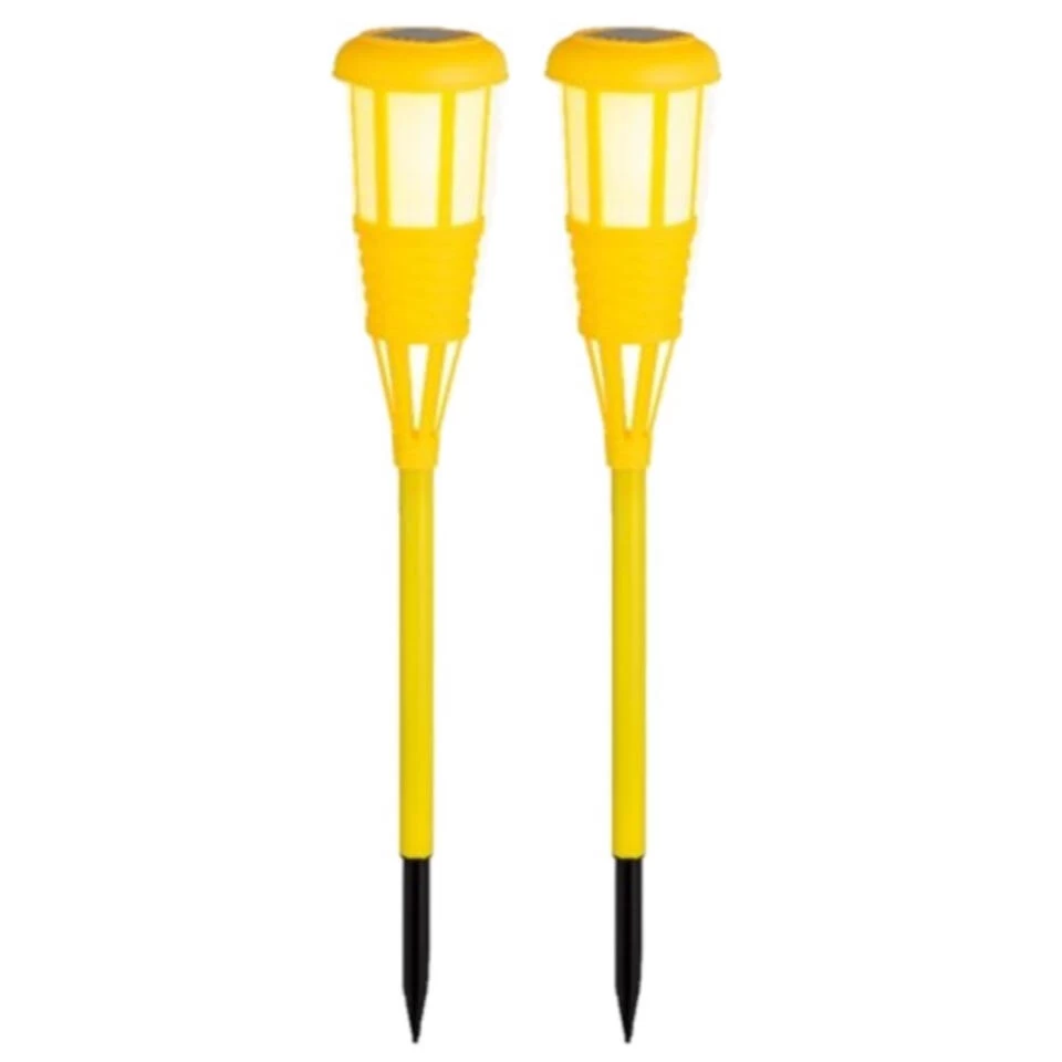 Solar tuinlamp/fakkel geel, met Led verlichting voor de tuin. De lamp werkt op zonne-energie waardoor het zichzelf oplaadt gedurende de dag. Inclusief grondpin, zodat u ze bijvoorbeeld langs een looppad kunt zetten. Schakelaar: ja. Kleur licht: warm wit. Kleur fakkel: geel. Afmeting: 10 x 61 cm. Inclusief vervangbare batterijen. Tuinlampen/tuinverlichting/prikspots op zonne-energie.