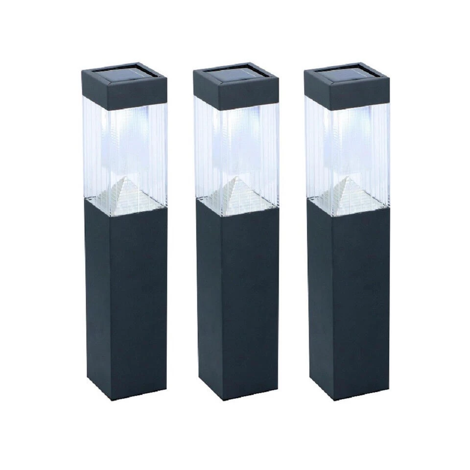 Een set met 3 solar tuinlampen/buitenlampen met LED verlichting, voor in uw tuin of op de camping. De lampen werken op zonne-energie en laden zichzelf gedurende de dag op. De palen worden geleverd met grondpinnen, zodat u ze bijvoorbeeld langs een looppad kunt zetten.