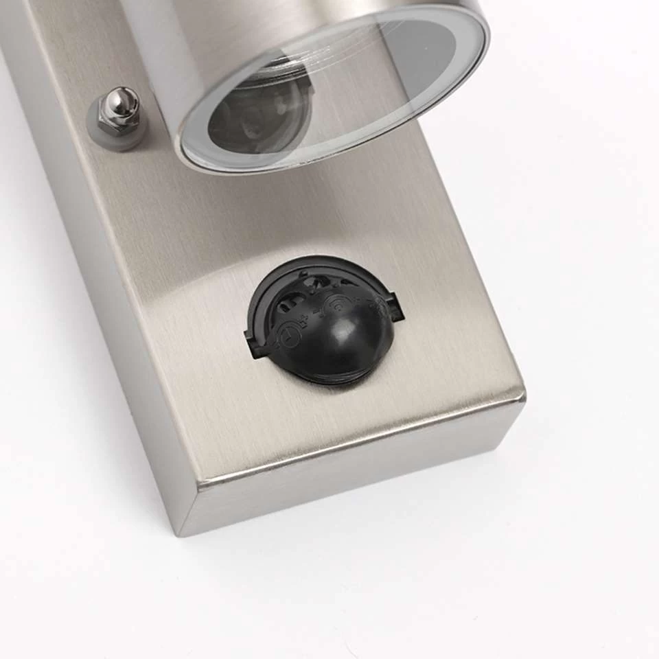 Deze wandlamp Duo uitgevoerd in RVS is een super functionele buitenlamp met strakke vormgeving en voorzien van een bewegingssensor. Je hoeft niet meer in het donker naar jouw huissleutels te zoeken. Duo zal reageren op bewegingen door de verlichting in te schakelen. Het licht van deze lamp straalt naar boven en naar beneden. Dit geeft een prachtig effect op de muur. Met een IP waarde van IP44 kan deze wandlamp tegen de regen. Ook is hij gemakkelijk aan te sluiten op 230 volt. De lamp heeft een diepte van 10,5 cm en een hoogte van 21 cm. De montageplaat heeft een lengte van 14,8 cm en een breedte van 6,7 cm. De lamp heeft twee GU10 fittingen en wordt exclusief lichtbronnen geleverd, zorg dat je deze er dus nog bij besteld. De lamp is dimbaar met een externe dimmer (dimmer niet inbegrepen). Deze moderne en strakke wandlamp Duo is zeker een aanwinst voor jouw gevel!