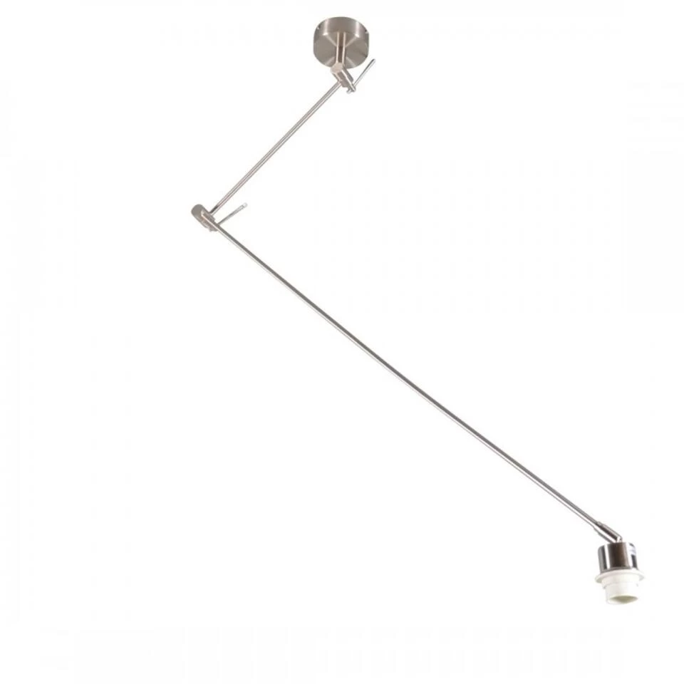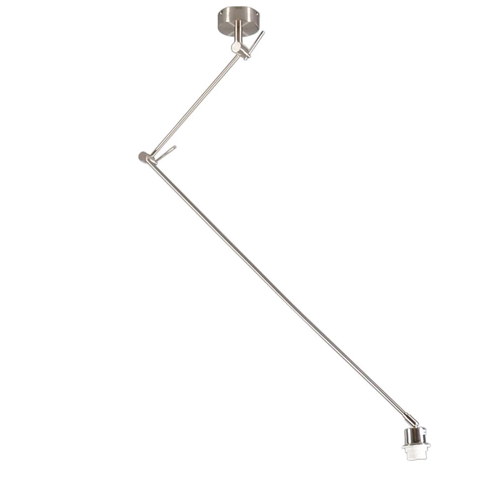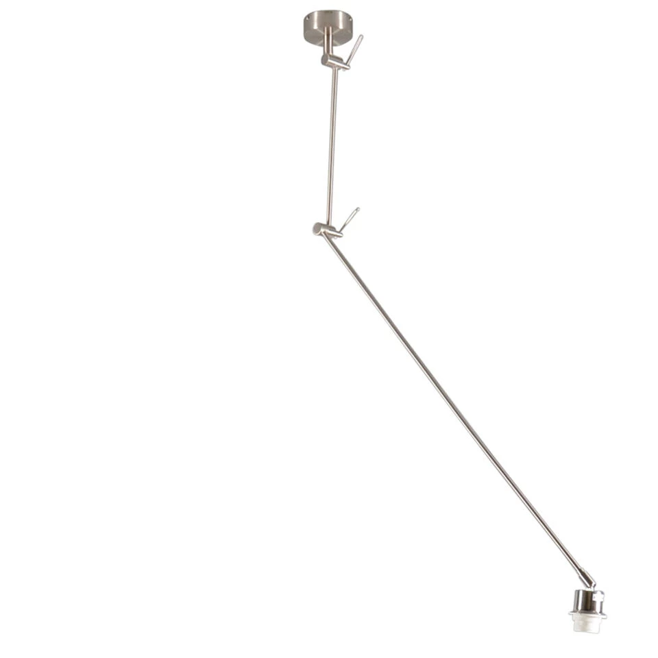 Strakke moderne stalen pendel geschikt voor alle kappen met E27 bevestiging. Door het basic design is de hanglamp goed te combineren met verschillende stijlen lampenkappen. Door de op drie plaatsen te scharnieren delen is deze lamp oneindig te vormen. De degelijke connectie delen zorgen er dan ook voor dat de gewenste vorm ook blijft staan zodra je deze in de gewenste vorm hebt gezet. Ideaal om te plaatsen waar het lichtpunt niet precies boven de tafel zit. De pendel is ook nog eens 350º draaibaar.
