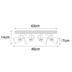 Maak je interieur stoer en landelijk met de plafondlamp Jelle. Zijn combinatie van staal met hout maakt het een robuuste en natuurlijke lamp. Hij heeft een hoogte van 14 cm, lengte van 46 cm en breedte van 8 cm. De montageplaat heeft een hoogte van 3 cm, lengte van 43 cm en breedte van 8 cm. De kappen hebben ieder een diameter van 7 cm en een hoogte van 8 cm. Maak Jelle compleet met 4 lichtbronnen met GU10 fitting (max. 8 Watt). De lamp is dimbaar met een externe dimmer, deze is niet inbegrepen. De spots zijn los van elkaar te verstellen, zo bepaal je zelf waar het licht naar toe schijnt. Maak jouw woonkamer, eetkamer of kantoor af met de landelijke plafondlamp Jelle.