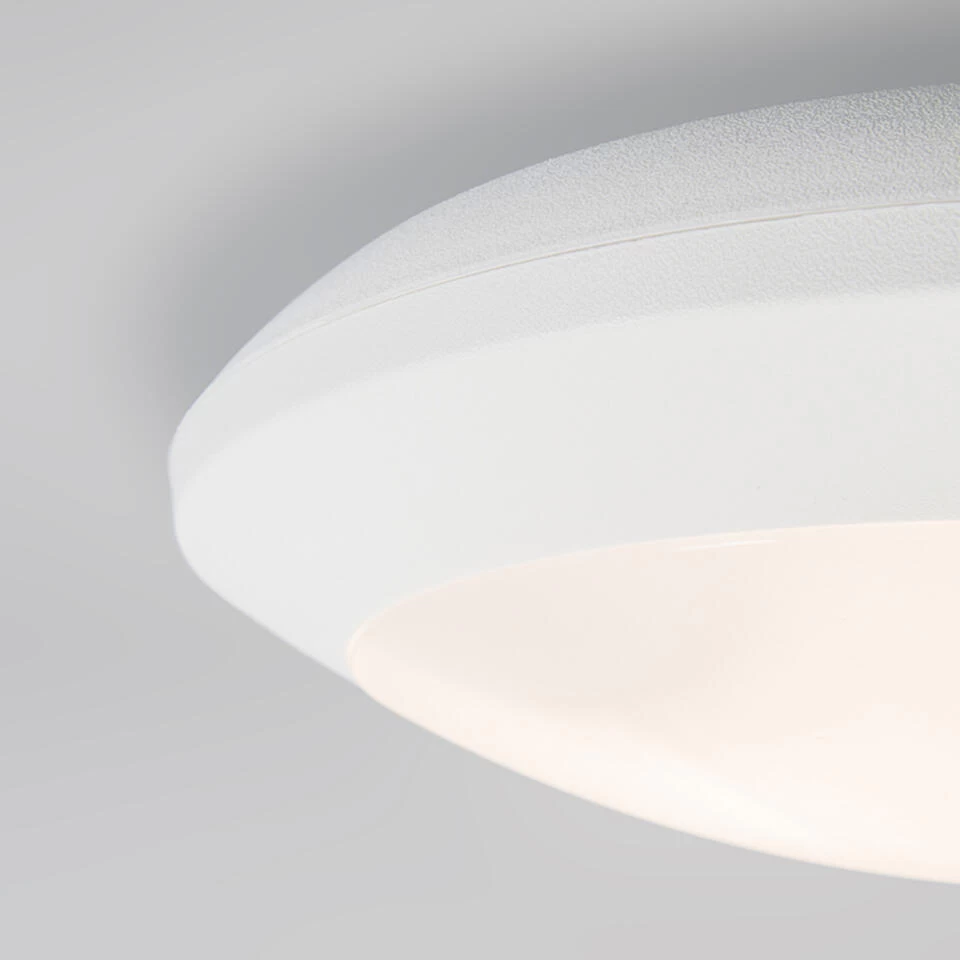 Een minimalistisch en strak design in ronde vorm is deze plafondlamp Umberta. Deze plafonnière met witte brede kunststof rand en mat wit kunststof geeft prachtig zacht strijklicht waardoor je niet in de lichtbron kijkt. De Umberta is voorzien van een bewegingssensor. Je hoeft niet meer in het donker naar jouw huissleutels te zoeken. Umberta zal reageren op bewegingen door de verlichting in te schakelen. Deze lamp heeft een IP waarde van IP65 waardoor hij geschikt is voor vochtige ruimtes zoals de badkamer, maar hij ook prima in de tuin geplaatst worden. Hij is namelijk bestemd tegen de regen. Hij heeft een diameter van 35 cm en een hoogte van 9,4 cm. De lamp heeft twee grote E27 fittingen en wordt exclusief lichtbronnen geleverd, zorg dat je deze er dus nog bij besteld (elk max. 60 Watt). Met deze plafondlamp Umberta zorg jij voor sfeer bij je terras of in je badkamer, aan jouw de keus.
