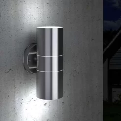 Deze wandlamp is gemaakt van roestvrij staal en verlicht iedere buitenplaats. Hij beschikt over een geïntegreerde lichtverspreider van helder glas. De lamp werkt op 4 LED-peertjes (niet meegeleverd) om een fijn, warm wit licht omhoog en omlaag te laten stralen. Met zijn IP44-beschermingsklasse is deze lamp weerbestendig en duurzaam. Hierdoor is de verlichting zeer geschikt voor buitengebruik.
